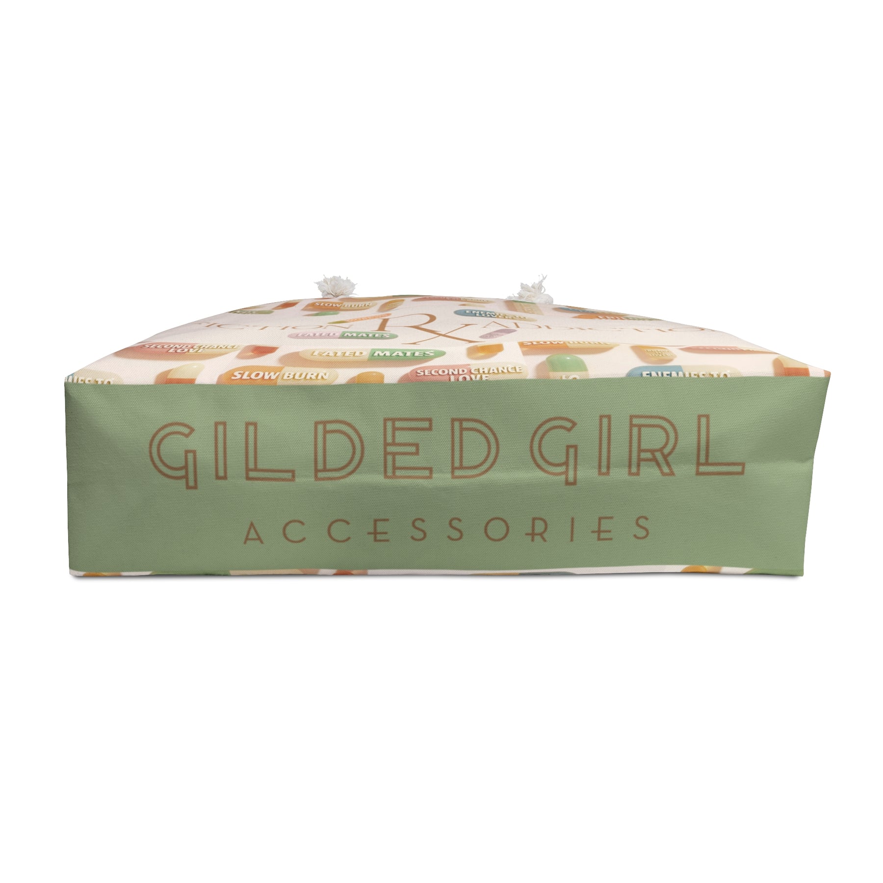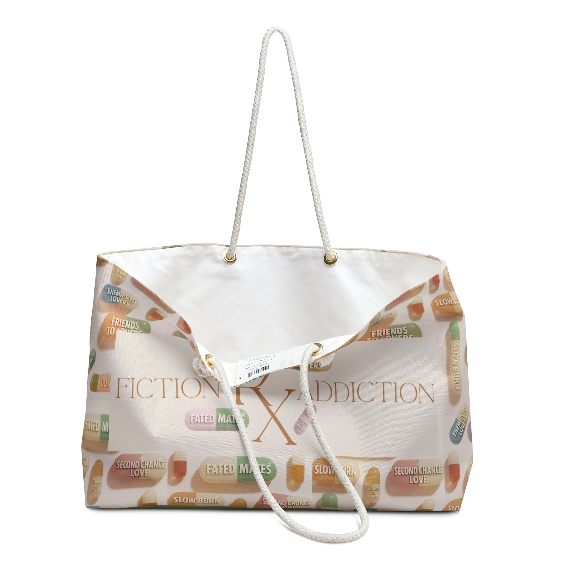 A roomy, sun-warmed weekender that feels like a chapter you can carry. Soft-spun polyester holds a playful print of colorful capsule motifs and a vintage prescription label that reads like a wink to book lovers who crave escape. The roomy T-bottom silhouette keeps piled sweaters, paperbacks, and a picnic blanket neatly in place while cream rope handles sit comfortably on the shoulder. Inside, a soft cream lining cushions fragile finds and keeps the mood light and airy. Lightweight yet structured, this bag marries travel-ready function with a cheeky nod to literary obsession — bring it to weekend reads on the porch, shelf-hunting trips, or lazy beach afternoons when you want your essentials and your aesthetic to travel together.
