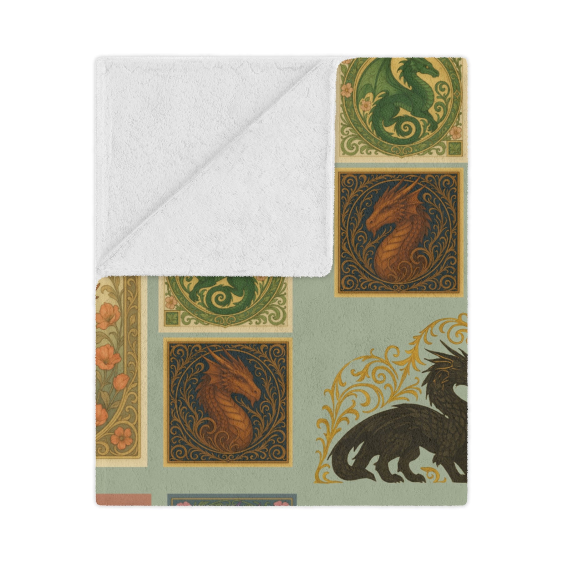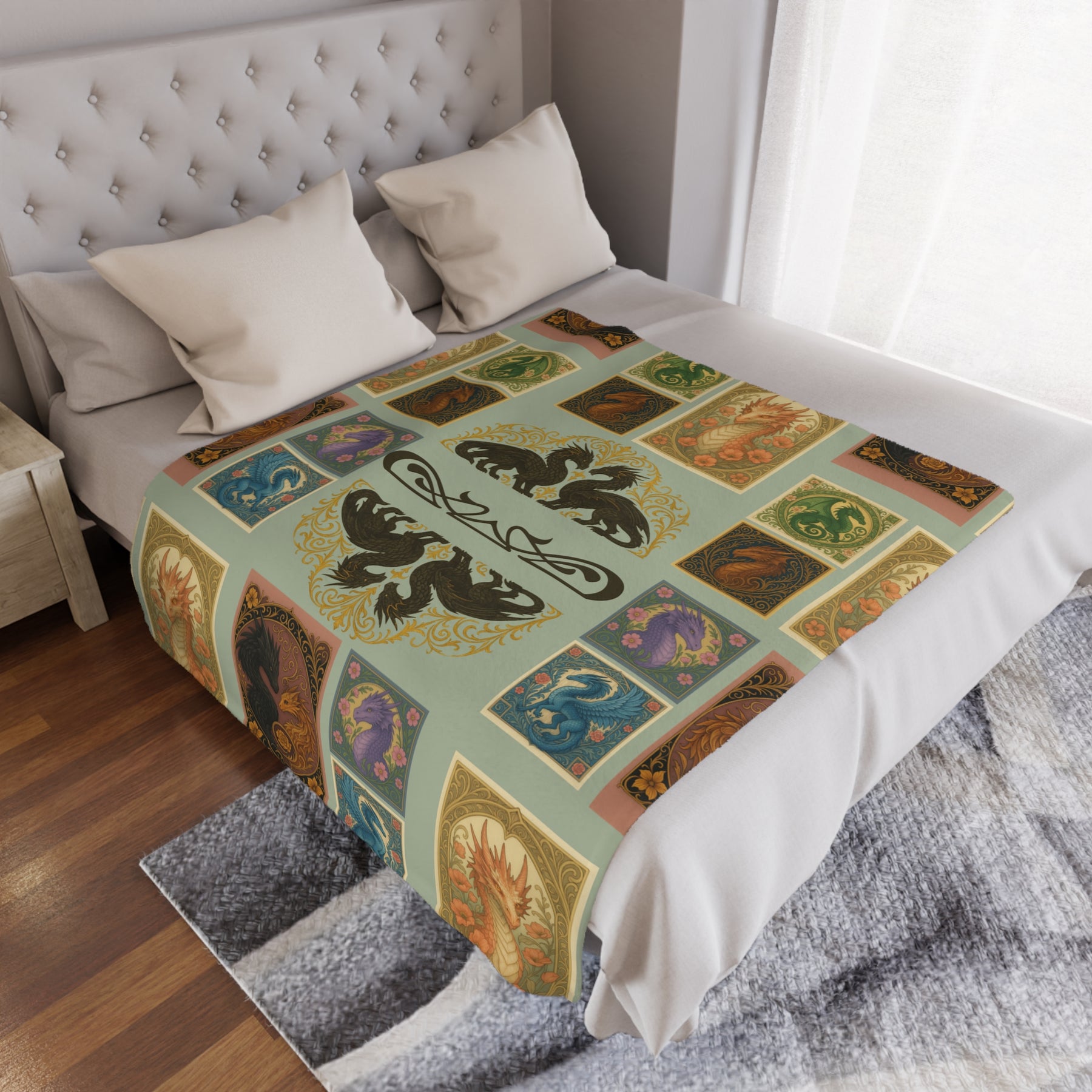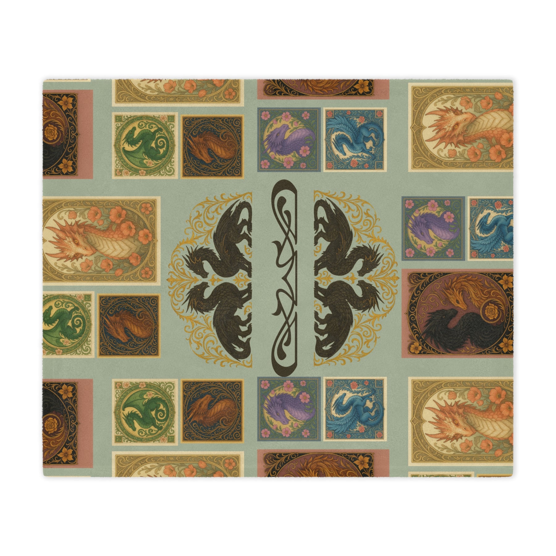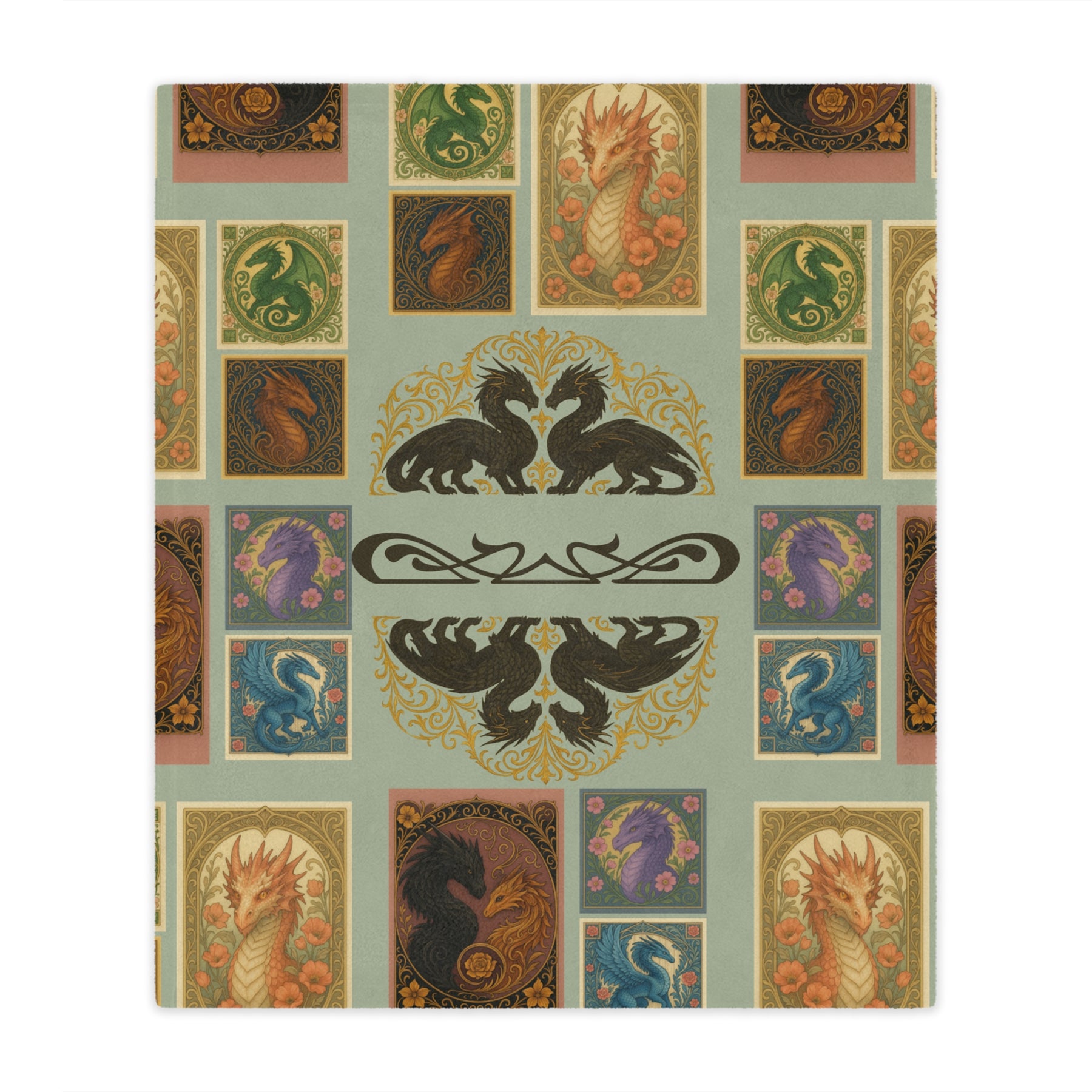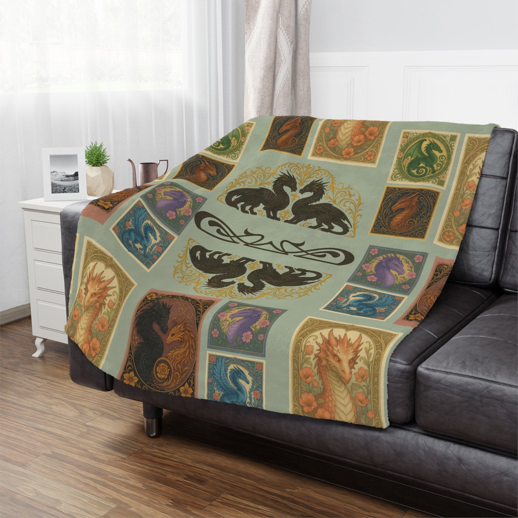 The design showcases a striking collection of dragons in jewel-toned frames, each one surrounded by ornate scrollwork that captures the mystery and majesty of sky-soaring leviathans. Made from luxuriously plush minky fabric, this blanket delivers both warmth and breathability—making it the ultimate companion for year-round comfort.