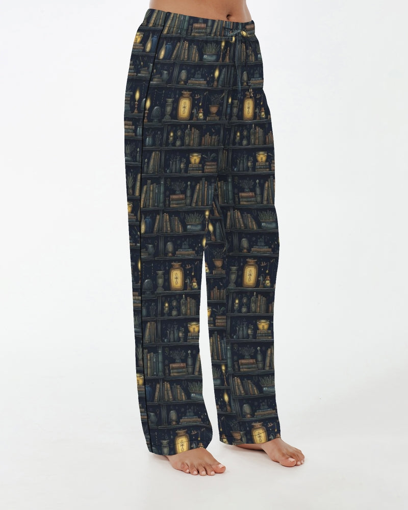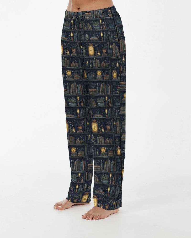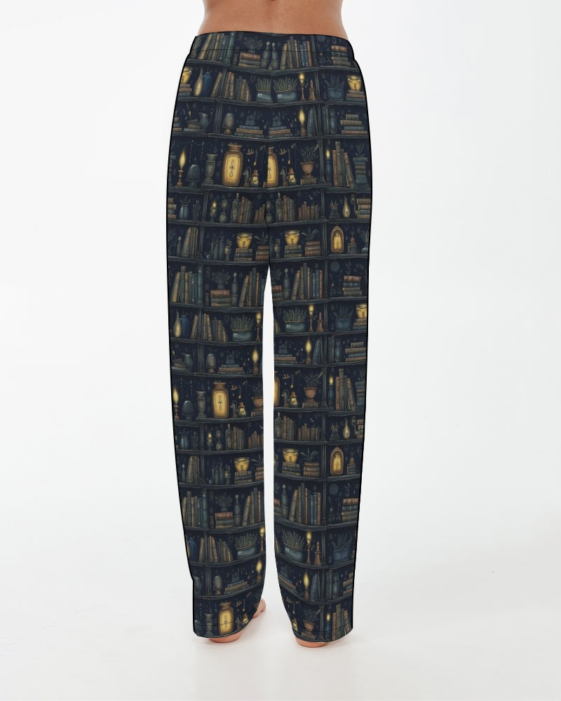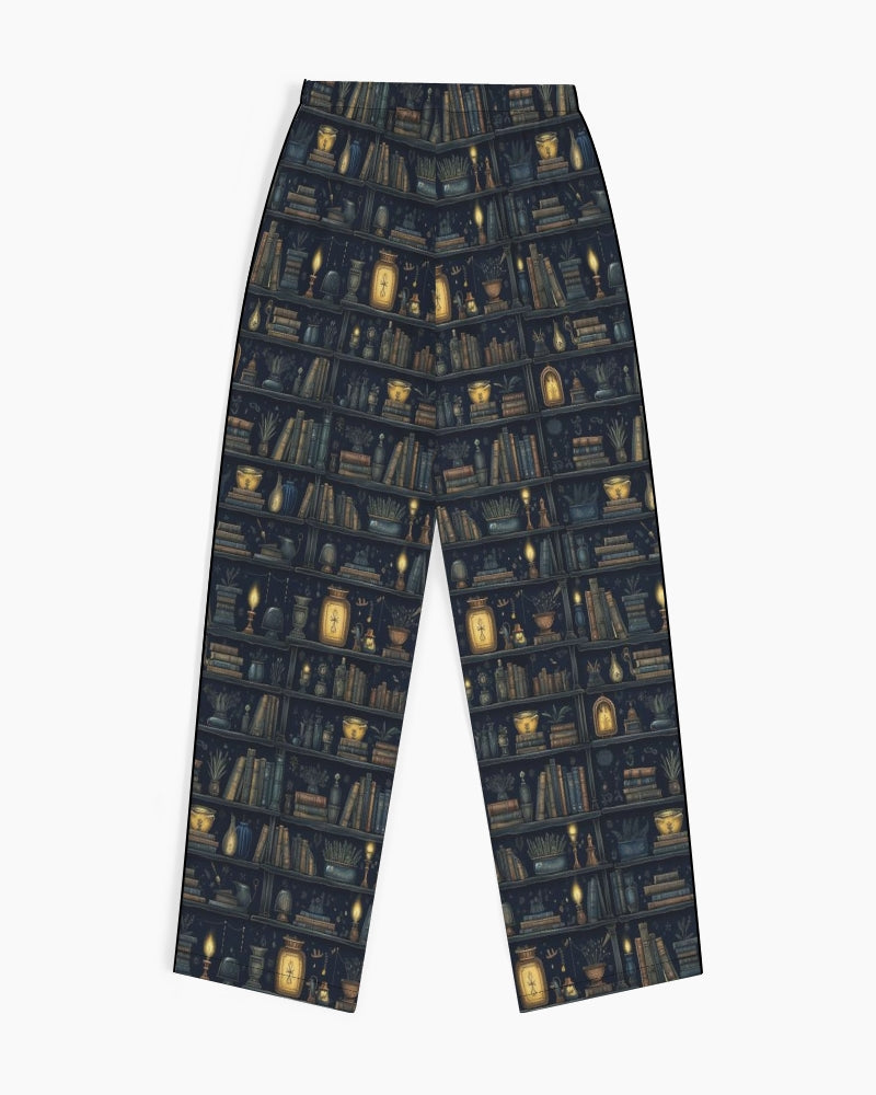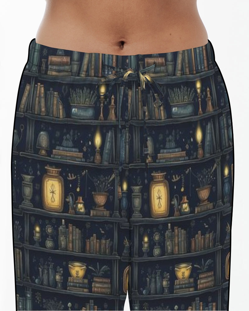 Satin pajama bottoms with enchanted bookshelf printInspired by morally grey characters and romantasy fandoms