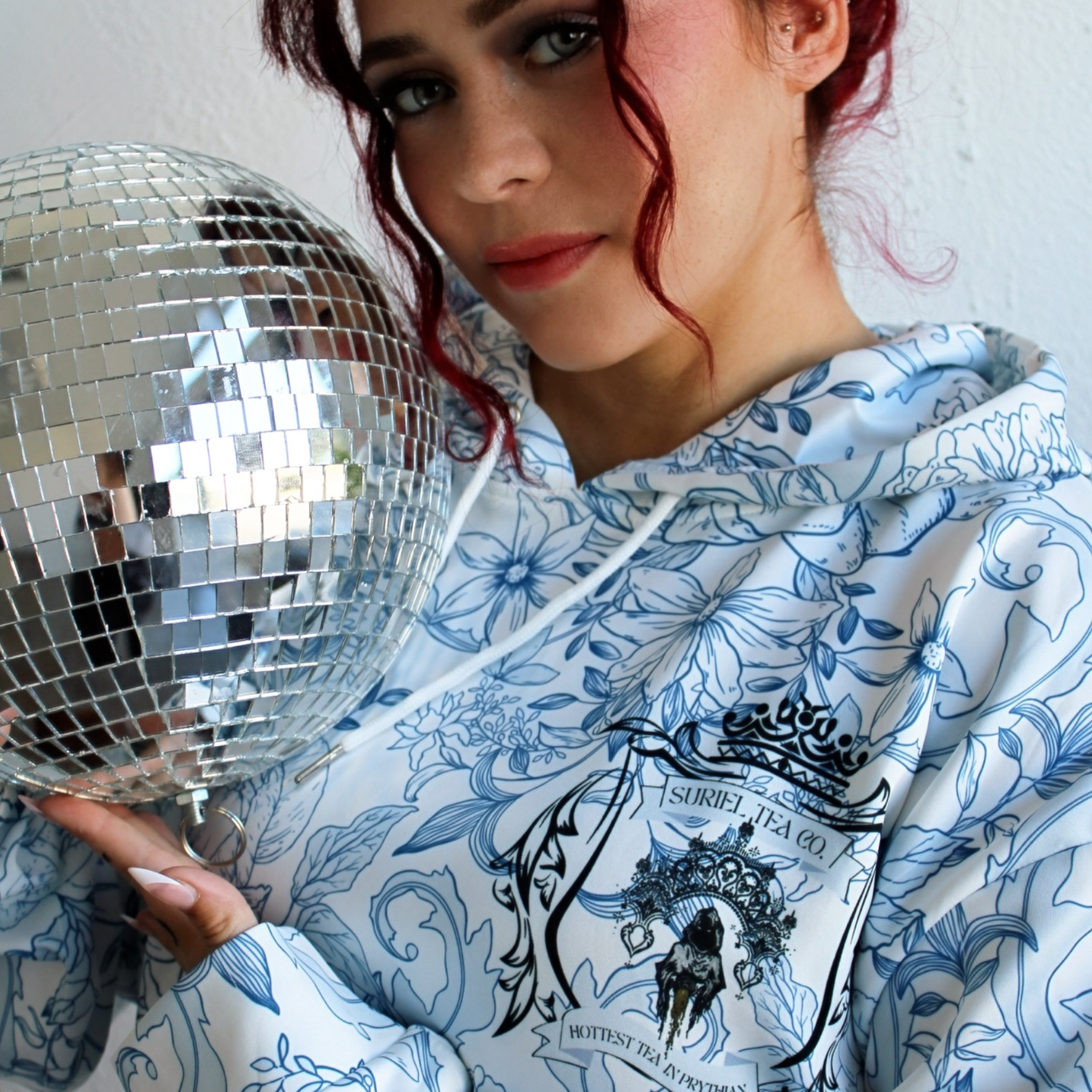 This unisex hoodie blends comfort, style, and a touch of tea-spilling sass—literally. Featuring original Suriel artwork inspired by A Court of Thorns and Roses, this blue and white floral print is a cheeky nod to bookish gossip and fae fandom, making it a must-have for romantasy readers who love a little drama with their cozy. Perfect for nights spent binge reading your favorite fantastical novels, this top blends ethereal elegance with mystical charm. The soft sports wicking fabric ensures comfort while the enchanting design brings your love for Romantasy to life. Whether you're lounging with a cup of tea or getting lost in a book, this hoodie is a must-have for every fantasy enthusiast who craves a touch of magic and romance in their wardrobe.