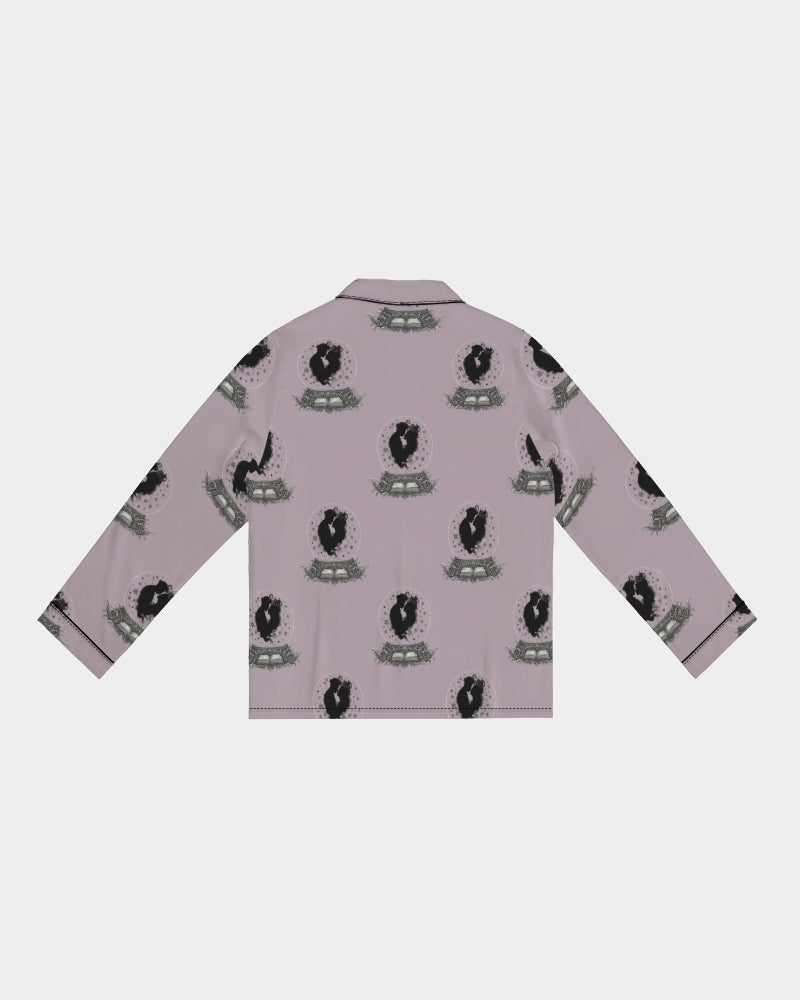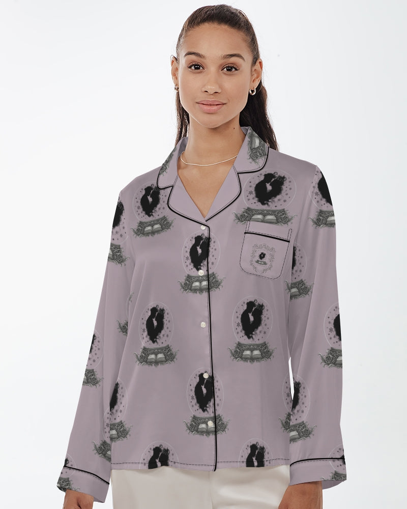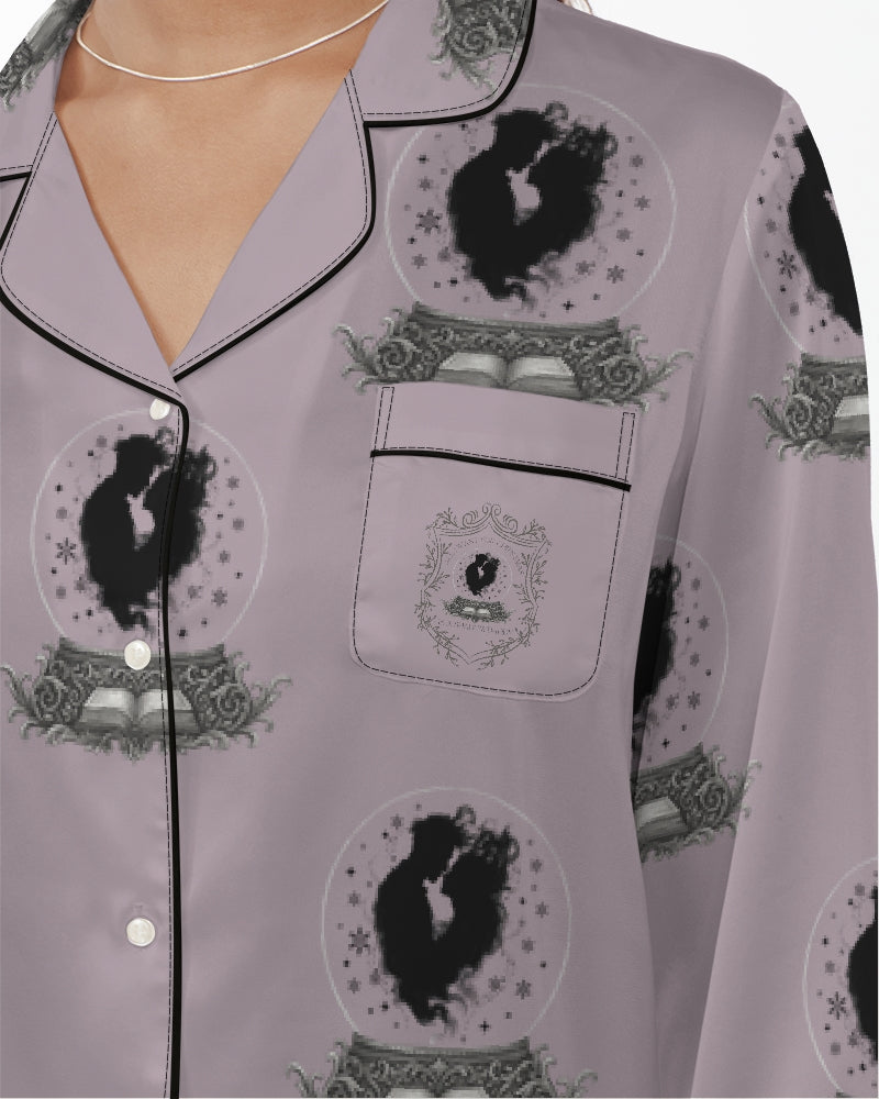 Crafted from buttery-soft satin, this dreamy buttery soft satin pajama top features contrast piping and our signature All I Want for Christmas is a Shadowdaddy Holiday Creston both the pocket and the back of the shirt. The design showcases our exclusive “Shadowdaddy” artwork—an ornate, gothic-inspired silhouette surrounded by a holiday snow globe with celestial details—perfect for fans of brooding, morally-grey book boyfriends.
