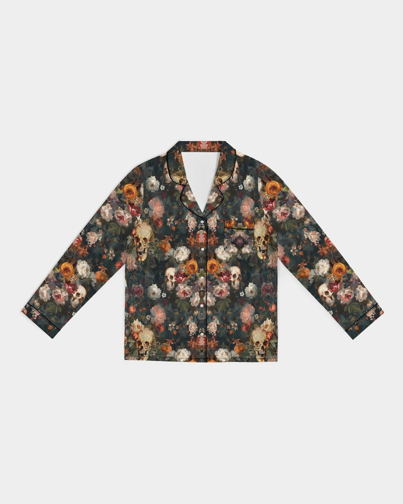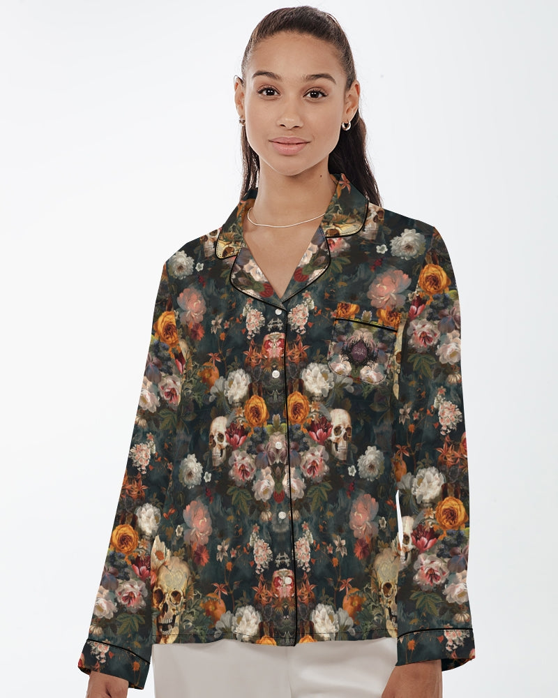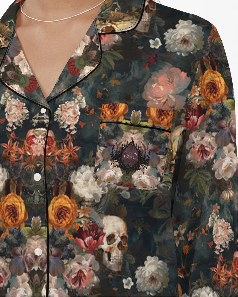 Featuring a hauntingly beautiful print of skulls, lush florals, and dark botanical details, this pajama top was designed for readers who love their stories with a hint of danger, desire, and darkness.